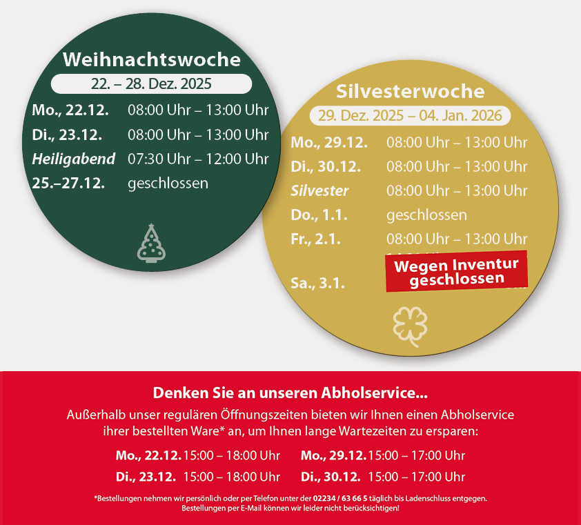 Ab dem 02.12.2025 können Sie Ihre Bestellungen bis einschließlich 17.12.2025 persönlich oder telefonisch unter 02234 / 63 66 5 bei uns aufgeben – jeweils bis Ladenschluss. Bitte beachten Sie, dass Bestellungen per E-Mail leider nicht berücksichtigt werden können.